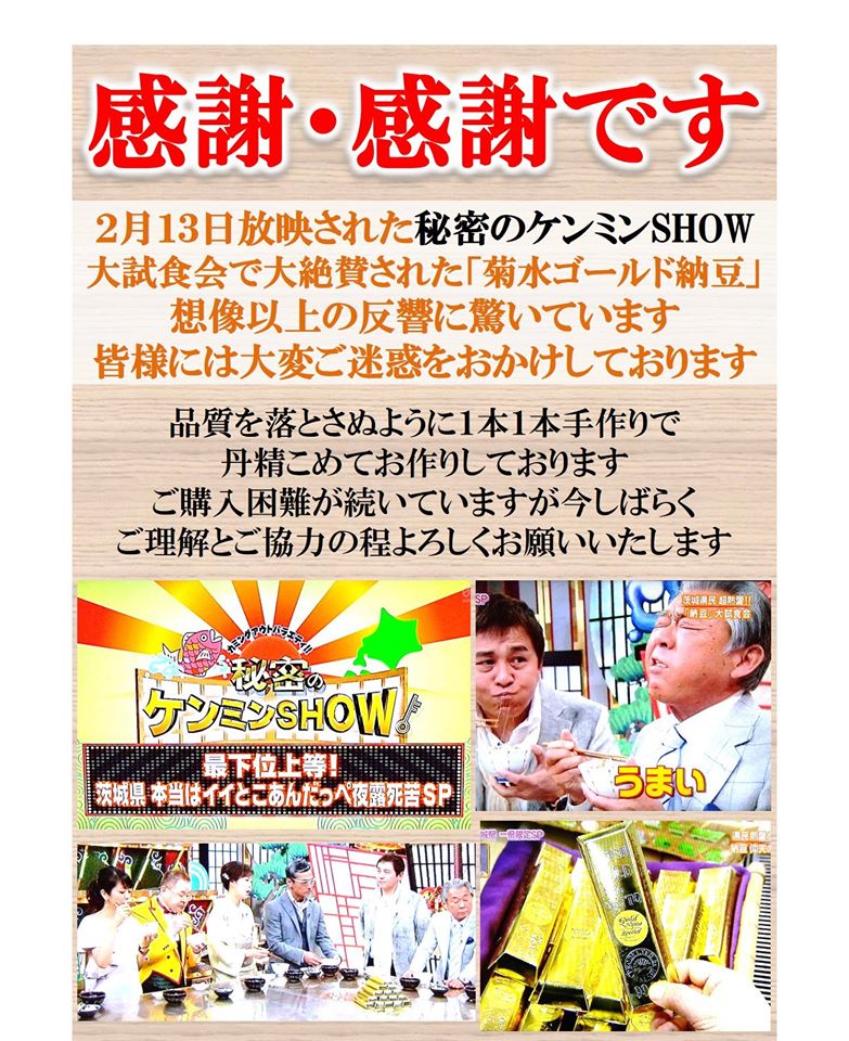 いざ世に出た「菊水ゴールド納豆」は、めずらしい、おもしろい、おいしい、もらった人がすごく喜んでくれるということで、ギフトにもってこいの商品となりました。「贈って楽しい、もらって嬉しい」というキャッチフレーズは、開発当初から啓司の目標とするイメージで、まさに夢が実現したのです。テレビや雑誌などのマスコミにも何度も取り上げられ、今では知る人ぞ知る存在です。